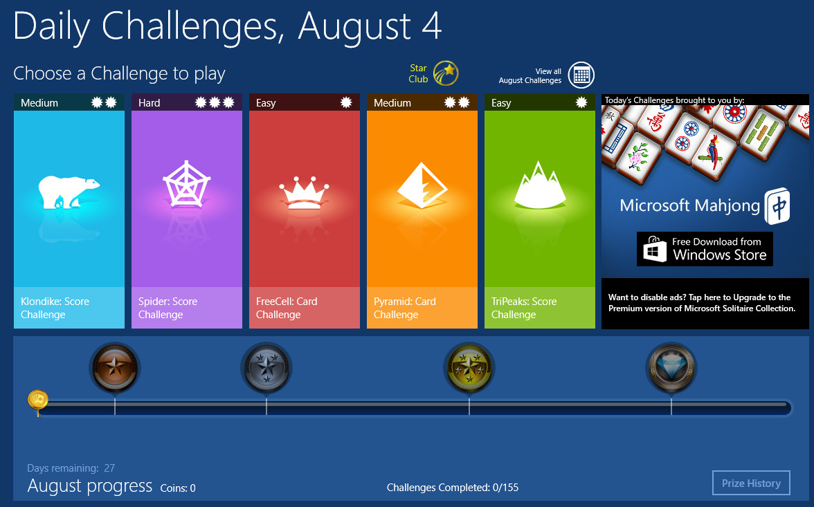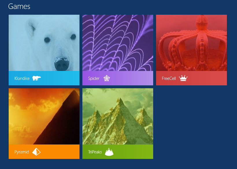 โดยคราวนี้ Solitaire นั้นได้เปลี่ยนรูปแบบใหม่เป็น Microsoft Solitaire Collection ซึ่งจะรวบรวมเอาเกมไพ่ที่คุณคุ้นเคยมารวมไว้เป็น 1 โปรแกรม ซึ่งจะมีทั้งเกม Klondike (หรือเกม Solitaire ที่เรารู้จักกันดี), Spider เกมไพ่ที่มีตั้งแต่ Windows ME , FreeCell เกมไพ่สุดยากประจำเครื่อง, Pyramid เกมแนวใหม่ที่ช่วยคุณบวกเลขได้อย่างแน่นอน และสุดท้ายเกม TriPeaks เกมภูเขาสามลูกที่ดูเหมือนเล่นยากแต่จริง ๆ ง่ายนิดเดียว