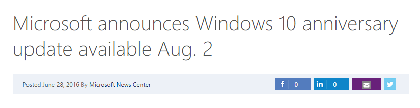 แต่ล่าสุด Microsoft ได้โพสต์ว่าจะปล่อยอัพเดทในวันที่ 2 สิงหาคม ซึ่งในโพสต์ที่ Microsoft ได้โพสต์นั้นไม่มีเนื้อหาใด ๆ ทั้งสิ้น เพียงแค่พาดหัวข่าว “Microsoft announces Windows 10 anniversary update available Aug. 2” เท่านั้น